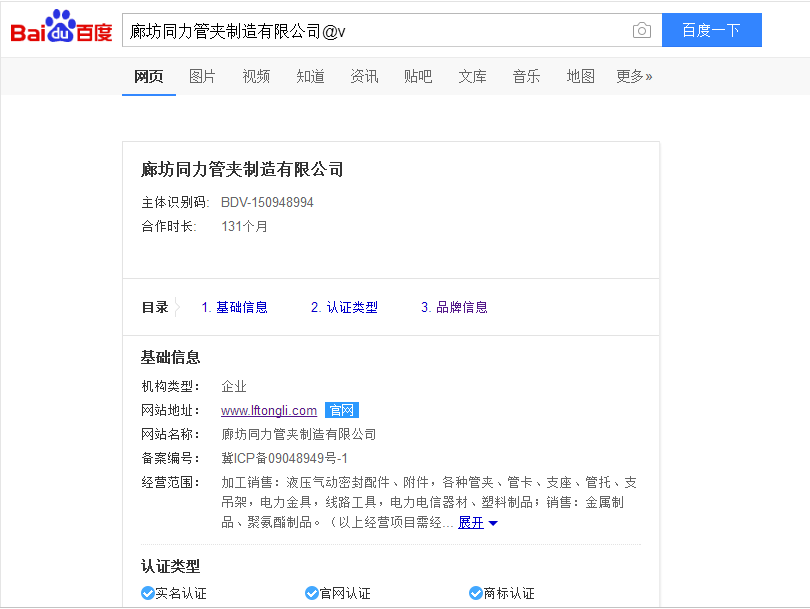 - 2018-08-28廊坊同力管夾制造有限公司成為百度信譽V3用戶,合作時間131個月。