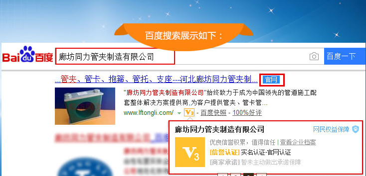 當前社會互聯網信息的體量是巨大的。在獲取資訊便捷的同時,虛假信息的泛濫也造成了諸多不便。如何能讓客戶在紛繁復雜的信息里面找到對的那一個,不會被虛假信息所蒙蔽造成損失,是我們同力管夾公司深切關注的。通過和百度信譽體系的合作,以百度大數據為依托,在2018年8月15日正式上線了百度官方網站認證。客戶在百度搜索欄中輸入“廊坊同力管夾制造有限公司”,排名靠前的消息且標題尾部掛墜藍色“官網”標識的即為我公司官方網站,網址為“www.techwin.cc”。客戶在這個網站里面看到的內容均為真實有效的,期待您的光臨,特此通知。